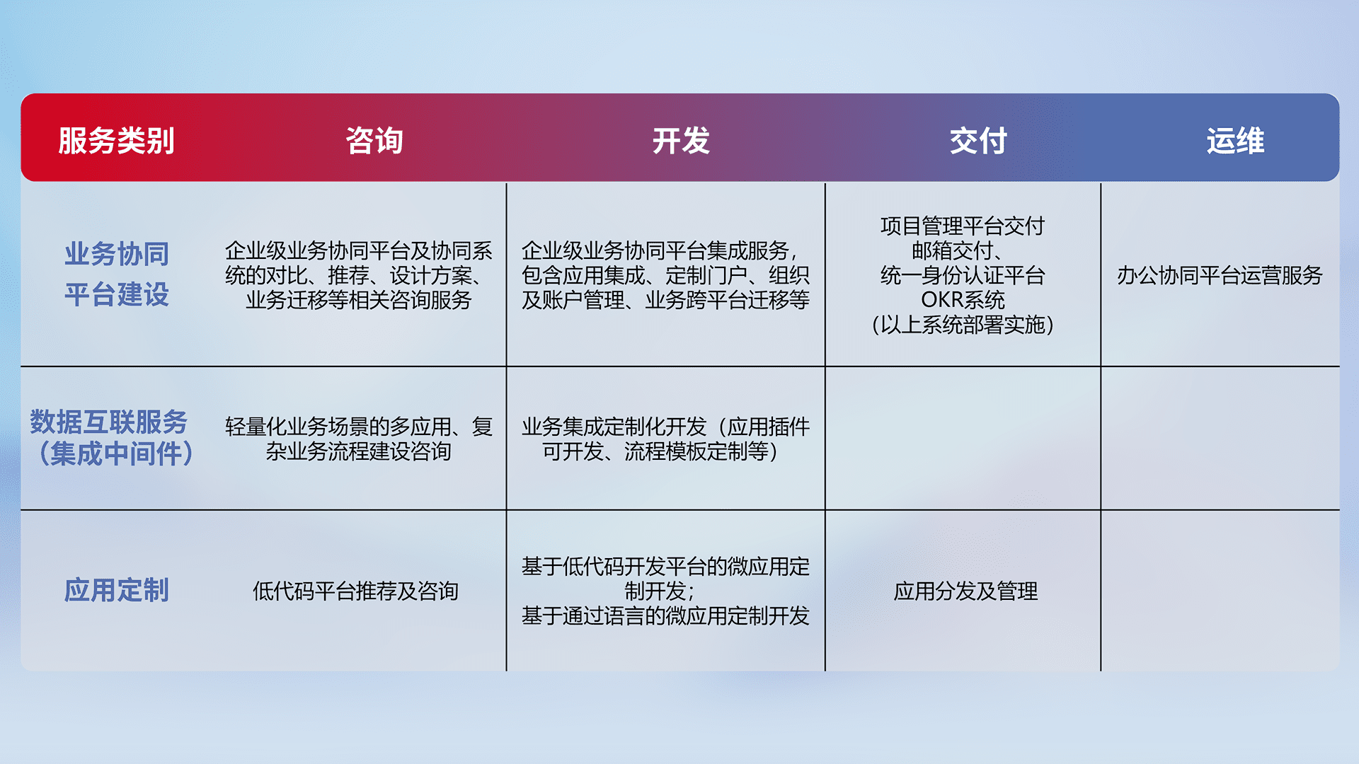 针对钉钉、、、、企微、、IDaas等平台级产品提供产品的规划、、方案、、、交付、、、定制化开发等服务,,,,实现如统一协同办公、、、、智能客户服务、、、、混合会议管理、、、智能数据查询、、、等业务场景,,,,实现数字化转型。。。。
