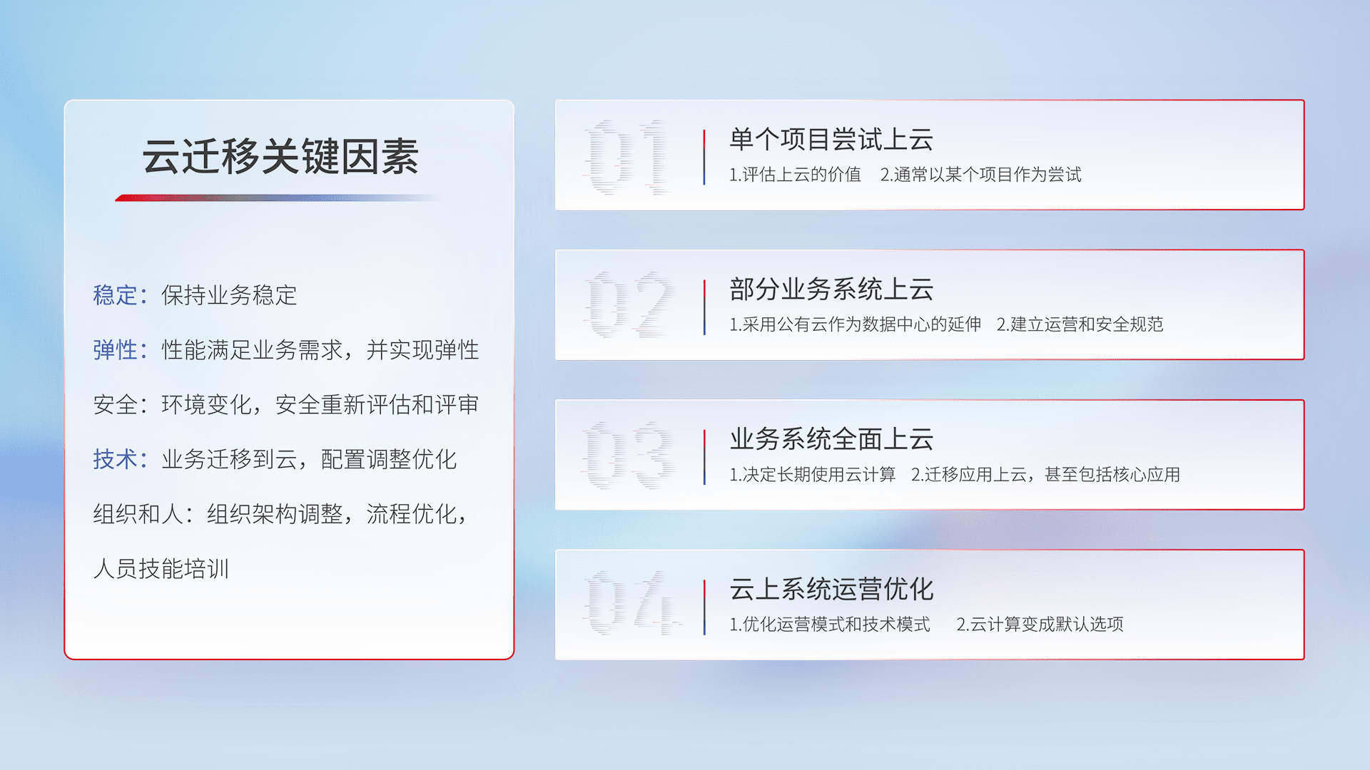 结合实际业务,,,,从规划设计、、云平台选型、、、云原生改造、、数据迁移、、、集成交付,,迁移全过程为客户识别最佳上云路径,,做好风险识别管理,,,设计网络架构、、、身份权限、、安全审计合规、、操作审计、、、、日志审计、、、、监控告警策略、、、多站点容灾设计等,,对云上基础设施进行整体规划,,,提升IT治理水平,,,,以满足弹性、、高可用、、、高性能的需求。。
